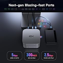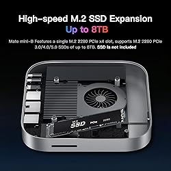 Next-gen Mac Mini M4 Dock: The Mac Mini dock delivers ultra-fast data transfer rates of up to 80Gbps for MAC Mini M4 Pro and 40Gbps for MAC Mini M4, making it ideal for video-intensive applications Universally Compatible: Beelink EX Mate Mini is not only built for Mac Mini, but also compatible with Any mini PC, laptop, all-in-one, desktop computers equipped with Thunderbolt 3/4/5 or USB4 ports Supports M.2 SSD Expansion: The Mac mini M4 Hub features a single ultra-fast PCIex4 slots, storage expansion up to 8TB, supports M.2 2280 PCIe3.0/4.0/5.0 SSDs. Note: SSD is not included High-Speed Connectivity Hub: All the ports you need in one sleek hub: 1*80Gbps USB-C port, 1*2.5Gbps Ethernet, 1* PD3.0, 1*SD 4.0 Slot, 2*USB-A 3.0 ports and 1* 3.5mm rear audio jack. Powered directly by your Mac mini for sub-15W peripherals. For Peripherals with total power demand exceeding 15W: Use an external PD adapter for power supply Quiet & Active Cooling System: Enable SSD to operate at low temperatures, providing efficient heat dissipation while minimizing fan noise, so you can enjoy its stable operation in a silent workspace What You Get: 1*Mate Mini-B, 2*80Gbps USB-C cables, 1*User Manual