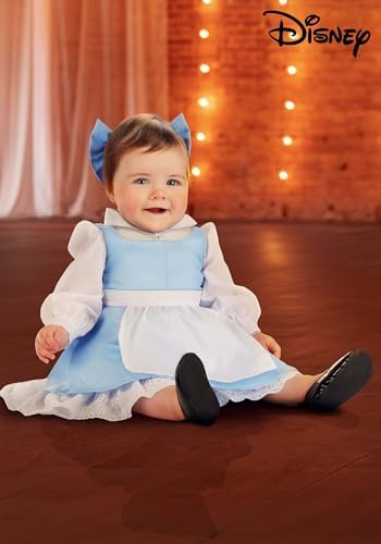 Introduce your little one to the world of fairy tales with this officially licensed Infant Belle Costume Dress for Girls from Beauty and the Beast. Inspired by Belle’s sweet and simple village outfit, this baby costume captures the beloved Disney character’s early storybook charm. Whether you’re dressing up for baby’s first Halloween, planning a Disney-themed family costume set, or celebrating a milestone with a magical princess photo shoot, this costume brings the story to life with adorable, age-appropriate style. This infant costume includes four key pieces: a white underdress, a light blue dress, a white apron, and a coordinating blue hair bow. The white pullover underdress is made from a soft blend of polyester and cotton for comfort against delicate skin, and it secures at the collar with a single button for a classic look. The sleeve cuffs also fasten with buttons for a secure yet gentle fit, helping keep your baby cozy throughout the day. The light blue dress layer features a zipper at the side seam for easy dressing and undressing, with blue suede lacing on the back threaded through silver grommets to mimic Belle’s charming book-loving look. A separate white apron ties easily around the waist, allowing for size flexibility and adorable flair. To top off the transformation, a blue hair bow with an attached black elastic band ensures a snug and photo-ready finish. Perfect for a range of magical moments, this Belle infant costume is ideal for Halloween trick-or-treating, Disney princess birthday themes, park outings, or simply delighting family and friends with a little touch of animated wonder. Available in multiple infant sizes (0/3M to 12/18M), this costume offers a sweet way to share the enchantment of Beauty and the Beast from the very beginning of your child’s story. - White Underdress - Blue Dress - Apron - Hair Bow