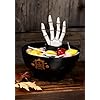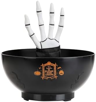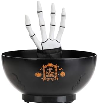- Includes one themed candy bowl with a sculpted bony hand that mimics Jack Skellington's long fingers; when guests reach for a treat, the hand moves for a surprise scare, making it a perfect interactive centerpiece for Halloween trick-or-treating and parties.