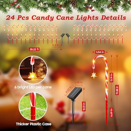- 【Upgraded 24-Pack Christmas Candy Cane Lights】This solar Christmas lights outdoor set includes 2 sets of 12 pack candy cane lights. Each light is equipped with 6 bright LED bulbs. Connected by durable copper wire with a total length of 28 ft(8.56m), these solar Christmas lights are easy to arrange and decorate as you like. With IP65 waterproof protection, solar powered Christmas lights shine steadily even in rainy or snowy weather. A perfect choice for outdoor Christmas decorations.