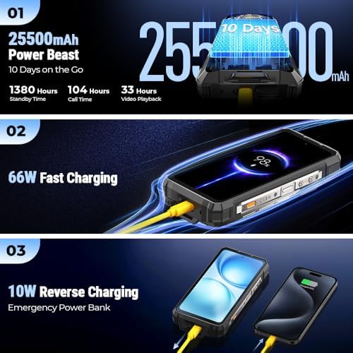 - 22500 mAh power battery and 66W charging: Ulefone Armor 33 Pro unlocked cell phone equipped with outlasting 104 hours of music, 33 hours videos or 1380 hours standby with the gigantic 22500 mAh battery. Charge in minutes with 66W fast charge or use 10W reverse charging as a portable power bank for camping or emergencies.