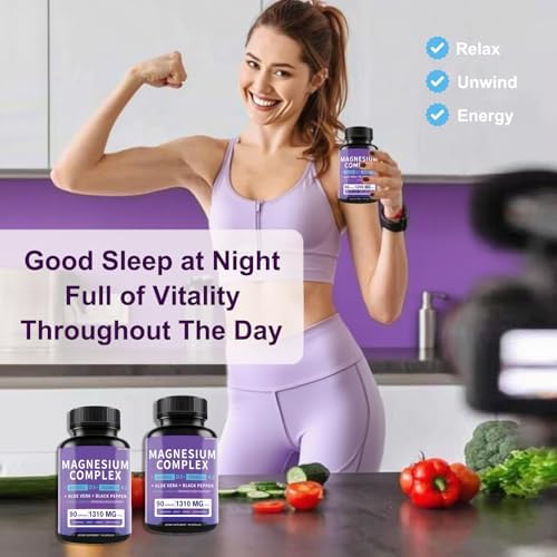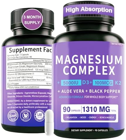 Magnesium Complex Supplement 1310mg - Chelated Magnesium Glycinate, Malate, & Citrate with Aloe Vera, Vitamin D3 & K2, Black Pepper - Stress Relief, Sleep, Nerve, Heart, Bone & Muscle* - 90 Capsules