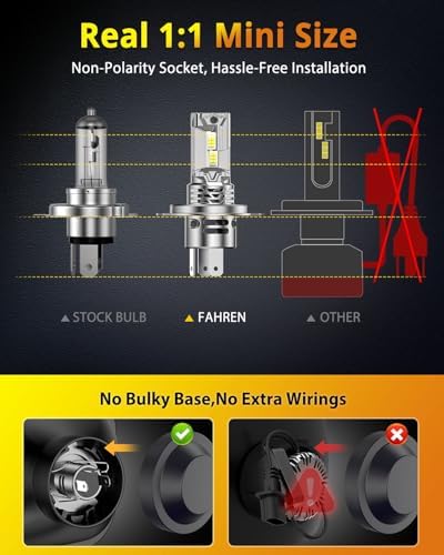 - 【1200% Brighter Than Stock Bulb– Drive with Superior Clarity】FAHREN H4 bulbs are equipped with 24 high-output CSP chips, delivering up to 1200% more brightness than stock bulbs. The 6500K cool white light provides visibility and reduces eye strain, helping you see farther and at night for , more confident driving in any low-light condition.
