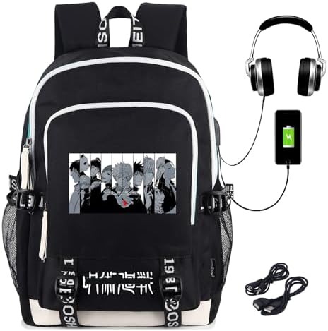 Anime Large Capacity Backpack for 15in Laptop Black Travel Backpack Casual Daypack Printed Rucksack with USB Charging Port & Headphone Port