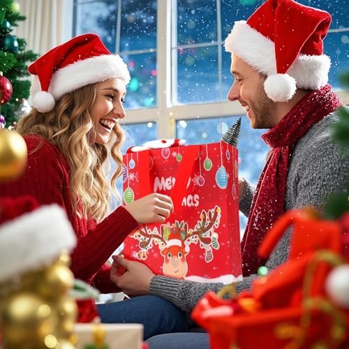 - Festive & Functional Christmas Gift Bags – These extra large 10.2*8.26*4.72 inch reusable gift bags feature classic holiday designs (Santa, reindeer, Christmas trees) – perfect for hassle-free wrapping of awkwardly shaped presents. No more struggling with paper!