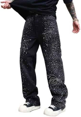 Mens Sparkly Rhinestone Jeans Vintage Loose Straight Leg Denim Pants