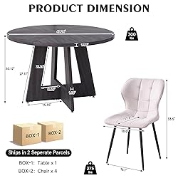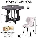 Ideal Dimensions and Comfort - A round table with a diameter of 47 inches and a height of 30 inches, featuring a tabletop thickness of 1.4 inches. The chairs, with seat dimensions of 17.3" Dx 18.9" W and a total height of 33.5 inches, promise comfort whether you're enjoying meals or working. Seamless Four-Piece Tabletop: With a thickness of 1.38", this tabletop offers extra sturdiness and durability. Made from engineered wood with a wood-grain veneer surface, it offers a natural look. The four-piece tabletop is seamlessly connected by flat metal brackets, ensuring stability and a sleek appearance. Fan-Shaped Base Design: Not only provides exceptional stability but also incorporates triangular mechanics for added durability. Its unique design adds an artistic touch to any space, with intricate cut-out patterns creating interesting light and shadow effects, enhancing the overall aesthetic appeal of your dining room. Comfortable Water-Repellent Seating: The upholstery features water-repellent, oil-repellent, and stain-resistant properties, making it incredibly easy to clean and maintain its appearance over time. The backrest and seat are crafted with ergonomic curves that provide excellent support, ensuring comfort even during prolonged sitting sessions. Fit Multiple Decor Styles. Designed in a farmhouse style, this table blends traditional and modern elements, making it a versatile addition to various home decor styles. Whether you prefer rustic, contemporary, or mid-century modern aesthetics, this table will be a standout piece in your dining area, living room, or conference room, enhancing the beauty and comfort of your space.
