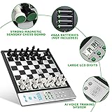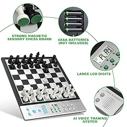 Electronic Chess Board for Adults: Comfortable size chess pieces, King height 2.36-inch, 10.5x10.5-inch chessboard with a 14.6 inches in diagonal for a wider playing field for better move planning and piece maneuvering. Enjoy a perfect and immersive chess moment! Computer Chess Set for Skill Level Up: Powered by a built-in chess engine with an ELO rating over 2200, offering challenges for beginners to masters. Quick computer' move without waiting. Adjustable difficulty levels ensure a tailored experience. Electronic Chess Set for Kids: Well designed Staunton-style chess pieces set, making it easier for children to distinguish between the pieces, ensure easy recognition and a touch of elegance. Extra queens for pawn promotion. Computer Chess Game with High-Sensitivity Chessboard Design: Effortlessly register your moves with a simple press on the high-sensitivity chessboard squares. Perfect for quick gameplay. Smart Talking Chess Board: AI voice tutor for chess teaching and learning, enhance your chess skills with our built-in AI voice tutor that analyzes and guides your moves in real-time, allows you to experiment, learn from mistakes, threats, and refine your strategies. Chess Electronic with learning features: Unlimited TAKE BACK until start position, swap sides with computer, get hint move from computer, Voice assistant for legal move announcement, set up chess problem and verify correct pieces position. Built-in 256 classic game records – come from the legendary matches of esteemed chess masters, including Paul Morphy, Garry Kasparov, and others. follow along with masters to replay their matches and absorb their strategic insights and chess wisdom. Built-in 128 endgame puzzles – 5 key tactical types: from Mate-in-1 to Mate-in-4 and win materials. perfect for beginners to grasp foundational chess tactics and strategies. puzzle diagrams book included for easy setup and practice Strong magnetic Chess Set for Kids: Pieces stay firmly in place - no wobbling or sliding! Quiet felt-padded bases reduce noise, yet are easy to lift and move - ideal for playing even on the go, such as in cars or trains. Portable & Durable Design for On-the-Go Play: Powered by 4 AA batteries with auto-power off and low-battery alerts, our chess set is designed for long-lasting gameplay. Includes EVA foam chess pieces storage for easy portability and protection.