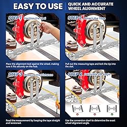 - Product Description Perform professional-grade wheel alignment at home with this all-in-one wheel alignment tool kit, designed to make toe and camber adjustments fast, accurate, and accessible. This automotive alignment tool features two precision-cut toe plates, dual measuring tapes, and all necessary hardware for easy setup. The front end alignment tool is perfect for adjusting wheel toe-in, camber angles, and restoring proper tracking, especially for rear-wheel-drive cars. Crafted from durable iron with a matte black finish, this car alignment tool kit includes everything needed for DIY repairs or shop use. Built-in wall mount holes make for easy storage, and the intuitive setup ensures even beginners can perform quick alignments. 【Package Includes】 Toe Plates ×2 Measuring Tapes ×2 Joining Plates ×2 Fasteners ×2 Wrench Tool ×1 【Wide Vehicle Compatibility】 This wheel alignment tool offers versatile fitment across a broader range of vehicles. It can be installed on models with lower chassis clearance and varied brake caliper bracket positions, ensuring reliable use in more scenarios. Multiple installation methods are supported, and measuring tapes are included for accurate setup.