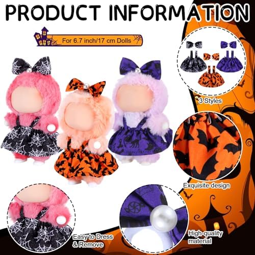 3 Pack Halloween 17cm Doll Clothes Set Cute Spiderweb Bat Ghost Outfit for Spooky Halloween Dressed up Doll Accessories (Not Included Dolls)