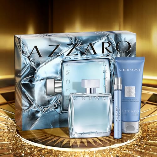 Azzaro Chrome Eau de Toilette - Fresh Aquatic Mens Cologne Set ($165 Value) - 3-Piece Holiday Set Includes Full + Travel Fragrance and Hair + Body Shampoo