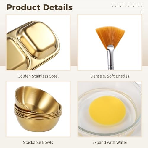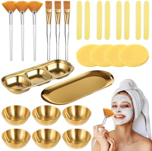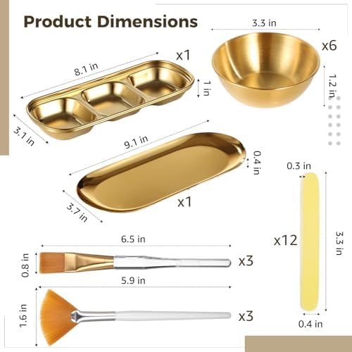 - Professional Set: Includes 6 golden mixing bowls, 1 serving tray, 1 three-compartment tray, 3 fan brushes, 3 mask applicator brushes, and 12 compressed facial sponges; provides estheticians with a full set of tools for facial treatments and skincare