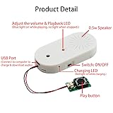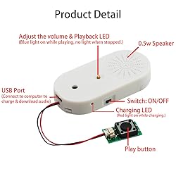 Support Download and Delete Music : The voice chips support download your own mp3 music, also record through MIC. You can connect to the computer to delete the built in music. Personalize your settings by adjusting the playback mode in the "config.txt" file. This allows you to achieve a personalized experience. 16 MB Storage Capacity : This sound module boasts a spacious 16MB memory, providing ample storage space to accommodate multiple favorite songs or recordings. By connecting the module to a computer using a USB-Micro cable, you can effortlessly add new audio files to the internal storage. This opens up a world of possibilities for your creativity, allowing you to easily modify and update the stored audio content according to your preferences and needs. USB Charging Recording Module : This recording module features a rechargeable design and is equipped with a big-capacity 3.7 V battery (110 mAh),fully charged takes approximately 90 minutes,played for about 120 minutes. It can be conveniently charged via the Micro USB-Type-C interface. This design extends the battery life, allowing for prolonged usage without the need for battery replacement. You can easily charge it by connecting it to a computer or using a charger, ensuring a full battery and enabling long-lasting usage with repeated charging cycles. Light and Portable : Multiplay recordable voice module card is lightweight (18 G), small (length, width 33mmX 67 mm X 11mm), simple and easy to operate,can allows you to adjust the volume and features an ON-OFF switch, ensuring the good listening experience. Enjoy full control over your audio creations with our voice recording module. After Sales Service : Please carefully read the user manual before Using. Any Question, please click GET HELP WITH ORDER under your order ID.We have own factory, Diverse style. Support customization Welcome to email us!