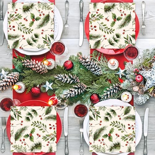 100PCS Christmas Holly Cocktail Napkins 5" X 5" Holly Berries and Pine Paper Napkins Xmas 3-Ply Disposable Beverage Napkins for Holiday Christmas Events Dining Kitchen Tableware Party Supplies