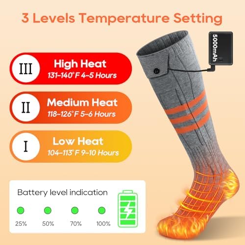 - 【Intelligent APP Control】We've upgrade our heated socks app with new features like timed temperature control and multi-level adjustments, streamlining the interface for a more intuitive user experience. With Bluetooth connectivity, you can easily control the temperature without removing your shoes or stooping. Perfect for outdoor activities like hiking, hunting, camping, and skiing in chilly conditions.