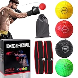 - Elevate your boxing training with this comprehensive reflex ball set designed to sharpen your reflexes and enhance your fighting skills. The set includes 4 color-coded balls of varying difficulty levels, allowing you to progressively challenge yourself as you improve. Two adjustable headbands with secure D-ring closures ensure a comfortable, customized fit for any head size. Perfect for both beginners and experienced boxers, this training tool helps develop hand-eye coordination, reaction time, and punching accuracy. The balls feature a durable, textured surface for consistent performance, while the elastic string provides the perfect amount of resistance for realistic training scenarios. Whether you're working on your defensive movements, punch combinations, or overall agility, this boxing reflex ball set offers a portable and effective way to train anywhere. Comes with a convenient carrying bag to keep all components organized. Regular practice with this set will help you develop faster reflexes, improved focus, and better overall boxing technique.
