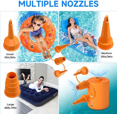 - Quick Inflate & Deflate with 4 Nozzles: Equipped with 4 interchangeable nozzles, our electric air pump for inflatables suits a wide range of items, from pool floats to sleeping pads and inflatable toys
