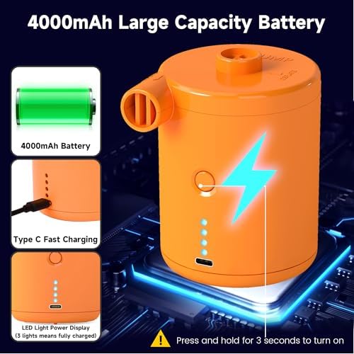 - Powerful & Portable Inflation: This mini air pump features a built-in 4000mAh battery, inflating a queen-size air mattress in just minutes. Compact and cordless, it's perfect for camping, travel, and home use