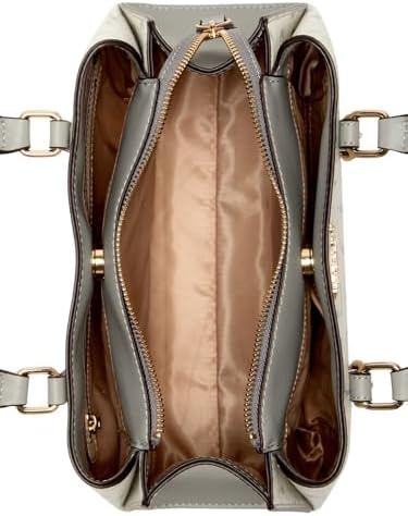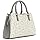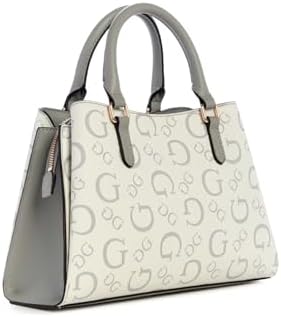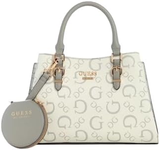 GUESS Factory Women's Aengus Logo Satchel Coated canvas satchel Allover Gvolve logo Shiny pale gold-tone hardware with front logo Organized three-compartment interior with lining Middle zip and magnetic side closures Top handles with buckle details and 4.25" drop. Adjustable/ removable strap with circle pouch. 11"W x 7.75"H x 4.5"D