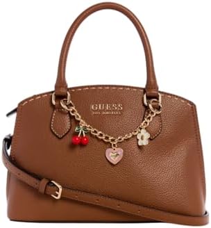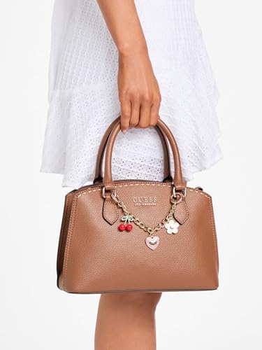 GUESS Factory Women's Lynne Charm Small Satchel Pebbled faux-leather small satchel Shiny pale gold-tone hardware with front logo Organized three-compartment interior with lining Zip closure Top handles with chain-link charm detail and 4.25" drop. Detachable crossbody strap. 10.75"W x 7.75"H x 4"D
