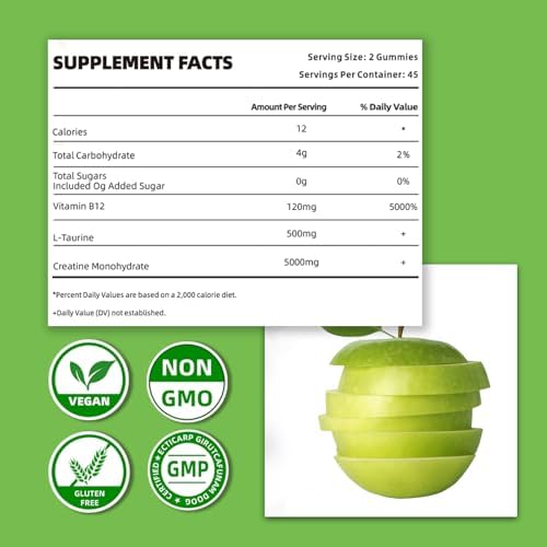 Green Apple Creatine Monohydrate Gummies 5g for Women & Men,Monohydrate+Taurine & B12,Sugar Free Pre Workout Gummies,Creatine Supplement Chews For Muscle Strength,Muscle Builder,Energy Boost(90 Count)