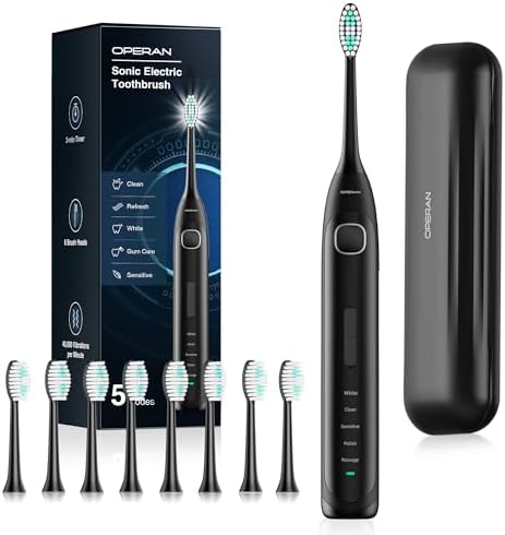 Operan Rechargeable Sonic Toothbrushes with 5 Modes 2-Min Smart Timer IPX7 Waterproof 40,000 VPM Motor with 8 Brush Heads & Travel Case Electric Toothbrush for Adults Travel Toothbrush (Black, 1Pack)