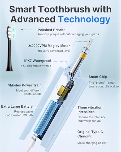 - Advanced Sonic Technology: Experience superior cleaning with the Electric Toothbrush for adults featuring a powerful 40,000 VPM motor that effectively removes plaque and promotes healthier gums. This sonic toothbrushes is designed for an advanced brushing experience for adults.