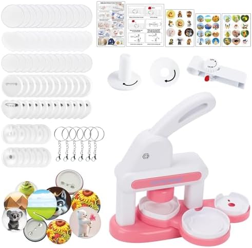 - Badge Button Making DIY Kit Includes: This all-in-one button making machine provides everything you need to start making personalized badges right away. You will receive a badge machine*1,drawing*3,small scissors *1,heart badge*12,keychain badge*6,fridge sticker*6,55mm badge*12,cutter*1,instructions*1