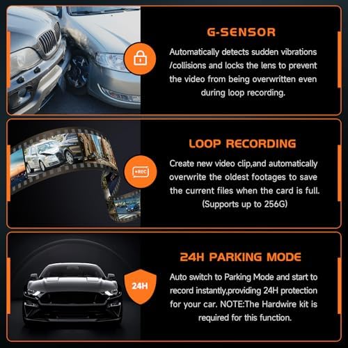 - 【24 Hours Parking Monitor and Time-Lapse】The parking monitor automatically activates and records emergency videos upon detecting collisions, (Requires hardwire kit, ASIN: B0D93L49TD). Dash cam that records 24/7 keeps recording with low power consumption and low frame rate, protecting vehicle from theft or vandalism.