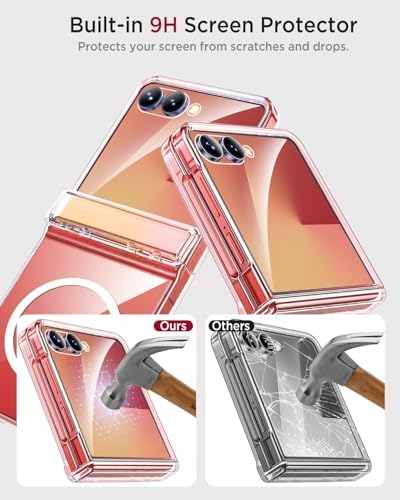 - 【Built-in 9H Tempered Glass Screen Protector】The Flip Phone Case Galaxy Z Flip 7 Transparent features a 9H hardness tempered glass screen protector, offering superior scratch resistance without compromising clarity. Whether you're navigating crowded streets, tossing your phone into a bag with keys and coins, or using it daily at work, the Funda Para Flip7 Case with Screen Protector resists scratches and accidental drops while maintaining flawless clarity and without dulling the vibrant color.