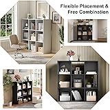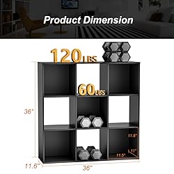 [Large Capacity Storage] Cubby storage organizer (36"L x 11.6"W x 36"H) features 9 spacious compartments (11.5"W x 11"H x 11.5"D each), providing ample storage for books, toys, office supplies, and more.this space-saving shelf keeps your essentials neatly stored and within reach! [High-Quality Material] Built to last with premium MDF construction, this stackable cubicle bookshelf features reinforced removable back panels for customizable stability and an impressive 60-lb capacity per cube (120 lbs on top shelf) - perfect for storing books, vinyl records, or storage bins. [Multi-functional cube shelf] Open cube storage shelf is the ultimate multi-functional solution for your home! Perfect as a bookcase, organizer, display cabinet, or even a TV stand and shoe cabinet,it effortlessly adapts to your needs.Store books,clothes, toys,and office supplies with ease, or showcase your favorite artwork and decorative pieces. [Aesthetics & Practicality] Black cube bookcase's minimalist design blends style with functionality: open cube design puts your favorite books and collectibles on display, while the discreet back panel cleverly conceals clutter for a clean aesthetic. Arrange it vertically as a space-saving tower or horizontally as a console display to perfectly fit your room layout. [Easy Assembly] We've included clear, step-by-step instructions and all necessary hardware for stress-free setup. Most customers complete assembly in under 30 minutes! And we provide complete anti-tip kits to securely fasten the bookcase to wall studs, meeting US safety standards for furniture stability.