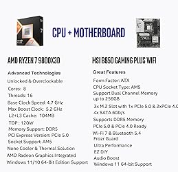 - MSI B850 GAMING PLUS WIFI Motherboard & AMD Ryzen 7 9800X3D CPU Processor What's included in the box: MSI B850 GAMING PLUS WIFI Motherboard Manufacturer Features Form Factor: ATX CPU Socket Type: AM5 Support AMD Ryzen 7000/8000/9000 Series Desktop Processors Dual Channel DDR5 up to 256GB Next-Gen Connectivity: 3x M.2 slot with 1x PCIe 5.0 & 2x PCIe 4.0, 4x SATA 6G port, USB 10Gbps Type-C Manufacturer Features: Supports DDR5 Memory, PCIe 5.0 Ready, Ultra Performance, Frozr Guard, High-speed Connectivity, EZ DIY, Audio Boost. AMD Ryzen 7 9800X3D CPU Processor Specifications Unlocked for Overclocking: Yes Base Clock Speed (GHz): 4.7 GHz Max Boost Clock: Up to 5.2 GHz Cores/Threads: 8/ 16 Cache (L2+L3): 104 MB TDP: 120 W Memory Support: DDR5 PCI Express Version: PCIe 5.0 Socket Support: AM5 OS Support: Windows 11/10 - 64-Bit Edition Unlocked & Unleashed Get the high-speed gaming performance of the world's best desktop processor. Encode faster. Render faster. Iterate faster. Create more, faster with AMD Ryzen 7 9800X3D CPU Processor, with MSI B850 GAMING PLUS WIFI Motherboard. Experience elite performance in games, content creation, and intense multi-tasking. A beautifully balanced design for serious PC enthusiasts.
