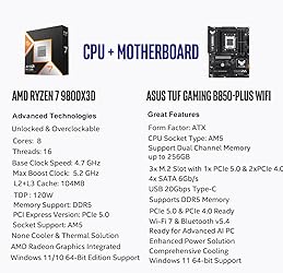 AMD Ryzen 7 9800X3D Desktop Processor, 8-Core, 16-Thread, 5.2 GHz Max Boost, Unlocked for overclocking, L2+L3 104 MB cache, DDR5, Default TDP 120W. The world's fastest gaming processor, built on AMD Zen5 technology and Next Gen 3D V-Cache For the state-of-the-art Socket AM5 platform, can support PCIe 5.0 on select motherboards. OS Support: Windows 11/ 10-64-Bit Edition. Cooler & Thermal Solution (PIB) not included. AMD Radeon Graphics Integrated ASUS TUF Gaming B850-PLUS Motherboard, ATX Form Factor, AMD Socket AM5, Dual Channel Memory DDR5 up to 256GB Support, PCIe 5.0, 1x PCIe 5.0 x4 M.2 Slot, 2x PCIe 5.0 x4 M.2 Slot, 4x SATA 6Gb/s ports, Wi-Fi 7, Bluetooth v5.4, Windows 11 Support, Ready for AMD Ryzen 9000 & 8000 & 7000 Series Desktop Processors Ready for Advanced AI PC: Designed for the future of AI computing, with the power and connectivity needed for demanding AI applications;/ Enhanced Power Solution: 14+2+1 80A DrMOS power stages, 8-layer PCB, 8+8 pin ProCool power connectors, alloy chokes and durable capacitors for stable power delivery;/ Latest M.2 Support: One onboard PCIe 5.0 M.2 slot and two PCIe 4.0 M.2 slots, equipped with all M.2 heatsinks Ultrafast Connectivity: Wi-Fi 7, PCIe 5.0 x16 slot, Realtek 2.5Gb Ethernet, rear USB 20Gbps Type-C port, front USB 10Gbps Type-C connector, Thunderbolt (USB4) header support;/ Comprehensive Cooling: Enlarged VRM heatsink, three M.2 heatsinks, PCH heatsink, hybrid fan headers and Fan Xpert 4;/ DIY Friendly Design: PCIe Slot Q-Release, new M.2 Q-Latch, Q-Antenna, Q-Dashboard, Q-LED, BIOS FlashBack and Pre-mounted I/O shield