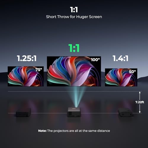 - 【Short Throw for Huge Screen】Ultra-short throw design (1:1 ratio) projects a massive image from just inches away. Perfect for small rooms or tight spaces, allowing flexible placement without shadows or walkway disruptions.