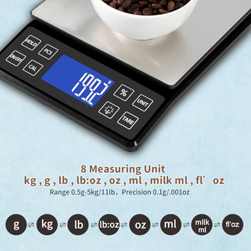 - 【 High Precision Measurement 】Our digital food scale offers 0.1g accuracy with a measurement range of 0.5g to 5kg, ensuring precise results for all your cooking and baking needs. Perfect for those who require precision in their measurements, this high precision scale is a must-have in every kitchen.