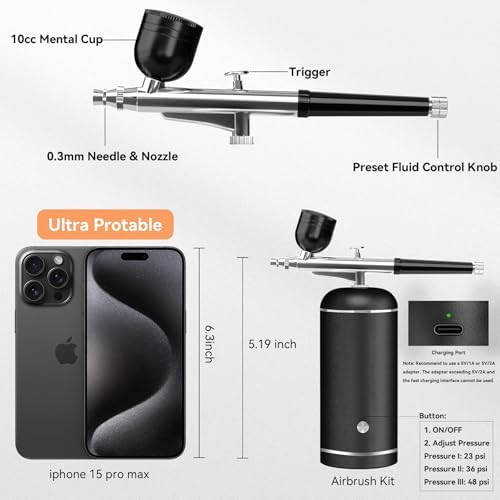 - 𝐔pgraded 𝐀irbrush 𝐊it with 𝐂ompressor:Our airbrush kit features a rechargeable battery that provides over 60 minutes of continuous use. Easily charge it via USB with a power bank, laptop, or any USB charger (Type-C). The cordless airbrush body includes an indicator light to show battery power, allowing you to unleash your artistic skills wherever you are. Note: Please use a 5V/1A or 5V/2A adapter to avoid damaging the battery.