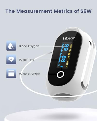 Rechargeable Pulse Oximeter Fingertip, Vibeat S6W Bluetooth O2 Monitor Finger with Real-Time Blood Oxygen Saturation & Heart Rate Tracking, Batteries and Lanyard Included