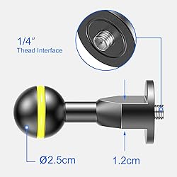 · [O-Ring Isolated Ball Joint] Features a 1-inch ball head with silicone O-ring gaskets to minimize metal friction, ensuring shake-resistant stability during connections. · [Precision-Engineered Marine Alloy] Machined from corrosion-inhibiting anodized aluminum for enhanced saltwater resistance, delivering industrial-grade durability at minimal weight. · [Dual-Threaded Mounting System] Equipped with twin 1/4"-20 screws for universal compatibility with standard threaded ports on cameras, housings, and peripherals. · [Modular Extension Hub] This spherical adapter functions as a rig expansion interface for chaining underwater systems, cameras, or devices requiring tandem setups. · [Torque-Lock Fastening] Secured via 1/4" screw compression creating semi-permanent bonds, providing vibration-dampened support and zero-play rigidity.