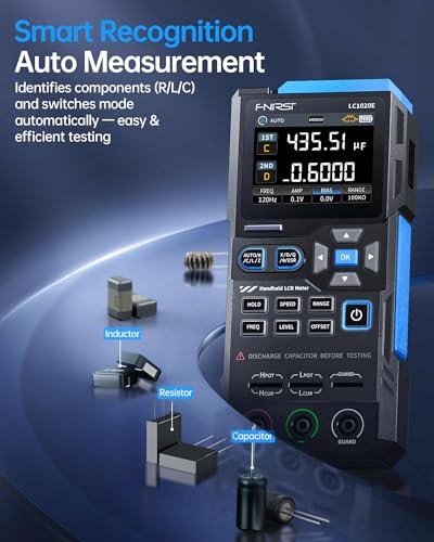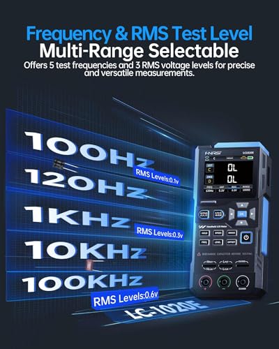 • 【Dual Parameter】FNIRSI LC1020E LCR Meter supports AUTO, Capacitance, Resistance, and Inductance with main/secondary parameters (X/D/Q/θ/ESR) shown simultaneously. Frequencies: 100Hz/120Hz/1kHz/10kHz/100kHz. 19,999-count display ensures precise readings
