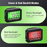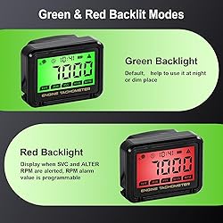 - Engine Tachometer: Easy to installed with its bracket, which is firm and stable and can be fixed on any tubular object. This tachometer is equipped with clips, just clamp the spark plug wire with the clip to receive the signal, safe and reliable. No external power connections are required, long service time. The tachometer has a battery power detection function. When the battery shows low, please replace the battery in time. Remove the bracket and open the battery door to replace the battery. The data is memorized and the data will not be lost when replacing the battery.Digital Tachometer: TOT, JOB, SVC, MAX RPM, RPM mode setting, RPM Alarm, CLOCK, Battery and memory function, Auto sleep and Reset. Also supports wireless sensing, optimal sensing distance 3cm-5cm. Widely used in hand-push mower, weed whacker, motorcycle, off-road vehicle, beach car, snowmobile, etc. Induction tachometer suitable for any gasoline engine.RPM Tachometer : 0-18,000rpm, RPM accuracy: ±10rpm; Timing Range: 0-9999hours,Timing accuracy: 0.1H. Refresh Rate: 0.5s. Wire Length: Approx. 2.2M. Screen Size: 40*22mm. (optimal sensing distance 3cm-5cm).SVC: Maintenance coutdown timer.The default time of SVC is 50H, and the setting In SVC interface, press the "S" button to enter the settings. Press the " M " or "S" to increase or decrease the data. range is 0-500H. Press and hold the M and S keys simultaneously for 5 seconds to reset and restore to factory settings.Backlight Engine Tachometer Hour Tachometer: Default green backlight will help to use it at night or dim place, Red backlight will remind when the engine RPM is higher than the set RPM alarm value. RPM alarm value is programmable.