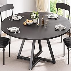 IDEAL FOR FAMILIES OF 4–6:This round dining table comfortably seats 4 to 6 people, making it perfect for daily meals, casual breakfasts, or weekend gatherings. A warm and functional centerpiece for both kitchens and dining rooms. COMPACT & SPACE-SAVING DESIGN:The cross-style base provides generous legroom and allows stools to tuck neatly underneath. Its compact footprint is ideal for apartments and smaller dining areas without sacrificing comfort. DURABLE & STURDY CONSTRUCTION:Crafted with a reinforced carbon steel pedestal and 25mm thick metal legs, this table offers excellent stability and support. The MDF tabletop is heat-, scratch-, and water-resistant for long-lasting daily use. INDUSTRIAL STYLE DESIGN: Add rustic charm to your home with its wood tabletop and cross base, creating a warm and inviting dining space. The blend of traditional farmhouse and modern design, paired with a wood grain finish, makes it a versatile fit for various home styles. Ideal for kitchens or dining rooms, it saves space while enhancing the room’s aesthetic. EASY ASSEMBLY & CUSTOMER SUPPORT:Includes detailed instructions, labeled parts, and pre-drilled holes for a quick, frustration-free setup. Our responsive customer service team is here to help—just reach out and we’ll reply within 24 hours.