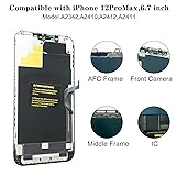 🌟【Premium Workmanship & High Quality】: OLED, (NOT LCD). High color saturation, high brightness, ultra-wide field, high resolution, thinner and lighter than LCD. 3D Touch, fast response and low power consumption. Water dripping and splashing resistance. Anti-oil, anti-fingerprint, make your phone look as clean as new. High strength to resist sharp objects, avoid scratches, explosion-proof, reduce the risk of broken screen. Super smooth and sensitive touch, more fluid experience, perfect feeling! 📱【Compatibility & Application】: The iPhone 12 Pro Max OLED screen replacement is ONLY compatible with iPhone 12 PRO MAX, 6.7 inch (Model A2342, A2410, A2411, A2412). NOT suitable for iPhone 12/12 PRO. The iPhone 12 PRO MAX screen replacement OLED provides effective solutions to various screen problems, allowing you to replace damaged screens. Using to replace the defective screen like the digitizer not respond, display problem, wrong color issue, distortion pixel, cracked or dead screen. 🍭【Easy To Install & Design For You】: The iPhone 12 Pro Max OLED screen replacement doesn’t include front camera, earpiece and sensors components, please transfer them from your original screen to install on the new screen. Full perspective, wide color gamut, you can use it with sunglasses. And you can use the True Tone, face ID and 3D touch normally like the original screen. Many professional repair shops get their screens from us to replace the screens of their customers' phones. 🎁【Package & Tips】: It includes 1 * compatible with iPhone 12 Pro Max OLED screen replacement + 1 * waterproof frame adhesive sticker + 1 * packaging box. No tools. The waterproof seal maintains waterproof ability. You need to remove other parts from original screen to new screen. You can install it according to the video on details page. The installation video also will be sent to you soon after you placed the order. Time-saving and money-saving! 📞【Warranty & Customer Service】: All iPhone 12 Pro Max OLED screens are strictly QC double tested and 100% in good condition before shipping. We believe our products and offer one year warranty for non man-made quality issues. We recommend watching the video before installation to avoid damage. The 4 corners of the screen are sensitive, please be careful during the installation. If there is any issue with the iPhone 12 Pro Max screen or you have any problem, please contact us by email directly.