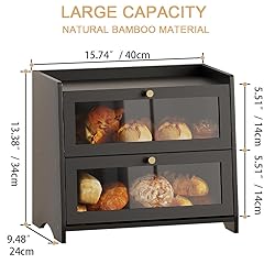 - [Two-Tier Bamboo Storage Solution] This double layer bread box features dual independent compartments with scratch-resistant acrylic doors. Crafted from eco-friendly bamboo in matte black, it keeps artisanal breads and pastries organized while preventing flavor mixing – ideal for sourdough and sweets storage. [Space-Efficient Vertical Design]Measuring 15.74*9.48*7.87", the 2 tier bread box maximizes counter space vertically, with a footprint similar to standard organizers. Raised feet protect surfaces, while the flat top holds jars or small appliances. [Separate Magnetic Access]Each compartment features a smooth magnetic closure and metal handle. Retrieve croissants or bagels one-handed without disrupting other items. [Sturdy Expandable Capacity]Pre-labeled bamboo panels and included tools enable quick assembly. Elevated corners safeguard both layers’ contents, doubling storage versus single-tier options. [Vintage Pantry Revolution] Beyond bread storage for homemade bread, organize fruits, snacks, or baking supplies in designated tiers. This countertop bread box transforms cluttered kitchens into curated spaces.