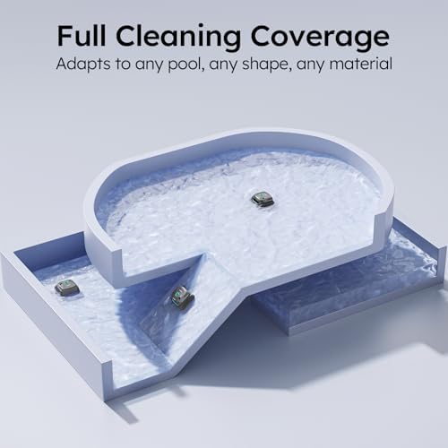 - Full Coverage Cleaning: The robotic pool cleaner cleans floors, walls, steps and waterlines, ideal for large inground pools up to 2152 sq.ft, water depth 9.84ft. Built in high-precision sensors realize smart path planing to clean different areas intelligently