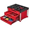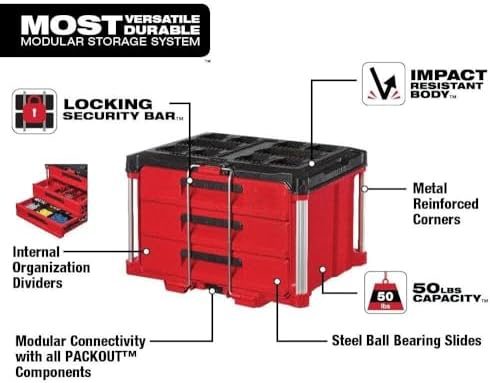 The PACKOUT 3-Drawer Tool Box (Model 48-22-8443) brings secure, modular storage to the jobsite or workshop. Designed with heavy-duty construction and built to withstand harsh conditions, this drawer unit provides organized, easy-access tool storage within the PACKOUT Modular Storage System. Featuring metal reinforced corners, smooth-sliding ball-bearing drawers, and a locking security bar, this tool box keeps your tools safe, secure, and always within reach.