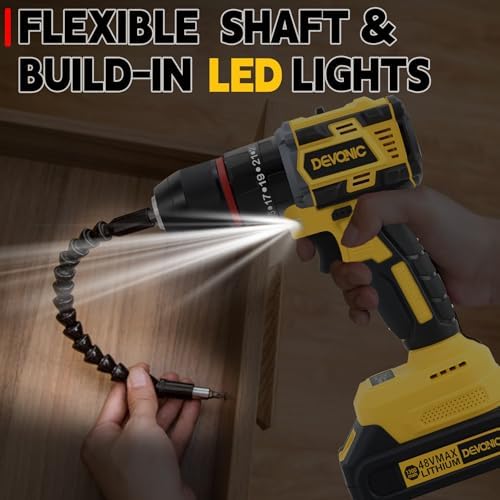 - 【Ergonomic Design】DEVONIC electric drill comes with shock absorber and a soft rubber over-mold handle to offers maximum user comfort and less vibration. You can control this tool without any sence of fatigue while using. Trigger-activated LED light illuminates your work area. The balancer on the top helps maintain horizontal accuracy.
