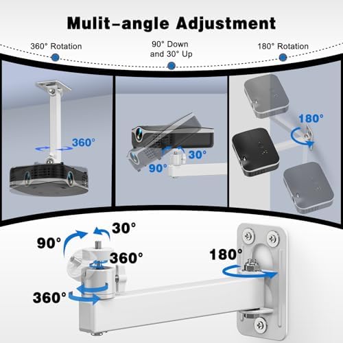 - Full 360° Adjustability – Perfect Angle, Every Time: Tilt (30-degree up and 90-degree down), position your projector exactly where you need it. 360° rotation – Ideal for short-throw projectors or awkward room layouts. The arm can be 180-degree adjust, no more neck strain—adjust for the best view from any seat!