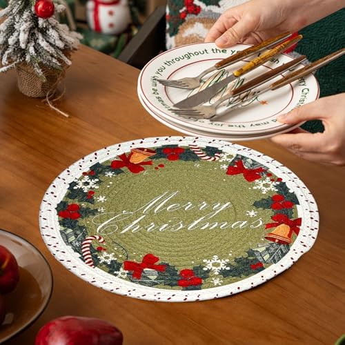 - 【Size & Functional】 Each Christmas placemats round measures about 13 x 13 inch, and are big enough to hold most dinner plates complements table runners for cohesive deco rand increasing the festive atmosphere for your dining time.