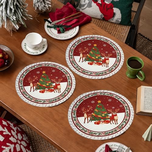 Premium Cotton Woven Christmas Placemats Set of 4–13 Inch Absorbent Holiday Round Table Mats with Festive Reindeer Prints, Heat-Resistant Banquet Table Mats for Christmas Dinner, Daily Use