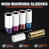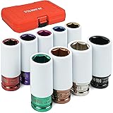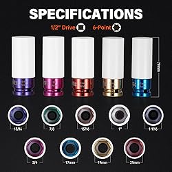 【WIDE COMPATIBILITY】 Covering the most essential metric & SAE sizes (17mm, 19mm, 21mm, 3/4", 13/16", 7/8", 15/16", 1", 1-1/16"), this 9-piece impact socket set is designed to service lug nuts on the vast majority of cars and light trucks. Its versatile design guarantees compatibility with all 1/2-inch drive tools, while the extended hollow shaft and secure 6-point grip ensure safe and effective lug nut removal. 【SCRATCH-FREE】 Each socket is fitted with a 360-degree rotating non-marring nylon sleeve and an internal protective collar, creating a complete scratch-proof system for your alloy wheels, bolt tops, and lug nuts during tire changes. Professional Tip: For wheels with exceptionally narrow lug wells, please verify the socket's outer diameter prior to use to ensure optimal access and performance. 【PREMIUM MATERIAL】 Forged from premium Chrome Molybdenum steel (Cr-Mo) and treated with advanced heat processes, these sockets achieve an outstanding balance of extreme hardness and impact resistance. The vibrant color zinc plating offers superior defense against rust and corrosion, ensuring remarkable durability and a prolonged service life for both professional and DIY use. 【THIN WALL & & INSTANT IDENTIFICATION】 The optimized thin-wall construction allows access to recessed lug nuts in tight spaces, making it ideal for modern alloy wheels. For quick and easy size selection, each socket is color-coded and features laser-etched size markings that are permanently fused into the material, guaranteeing they will not wear off or become illegible over time. 【SECURE STORAGE CASE】 A custom-molded carry case is included to keep your 9-piece set perfectly organized and protected. This compact case prevents rust, loss, and rattling, making it effortless to store and transport your sockets in your truck, garage, or mobile toolbox, ensuring they are always ready for your next job.